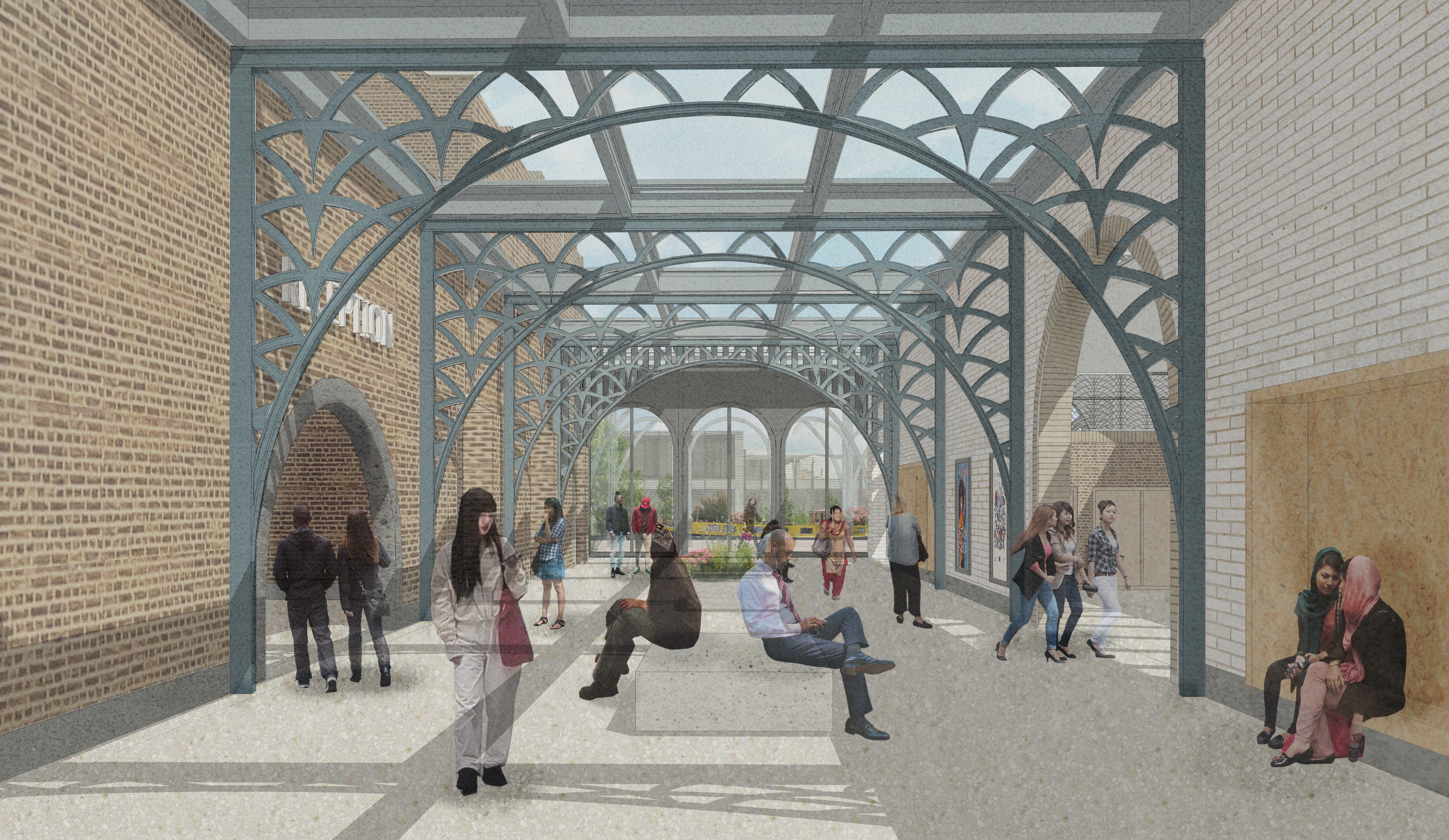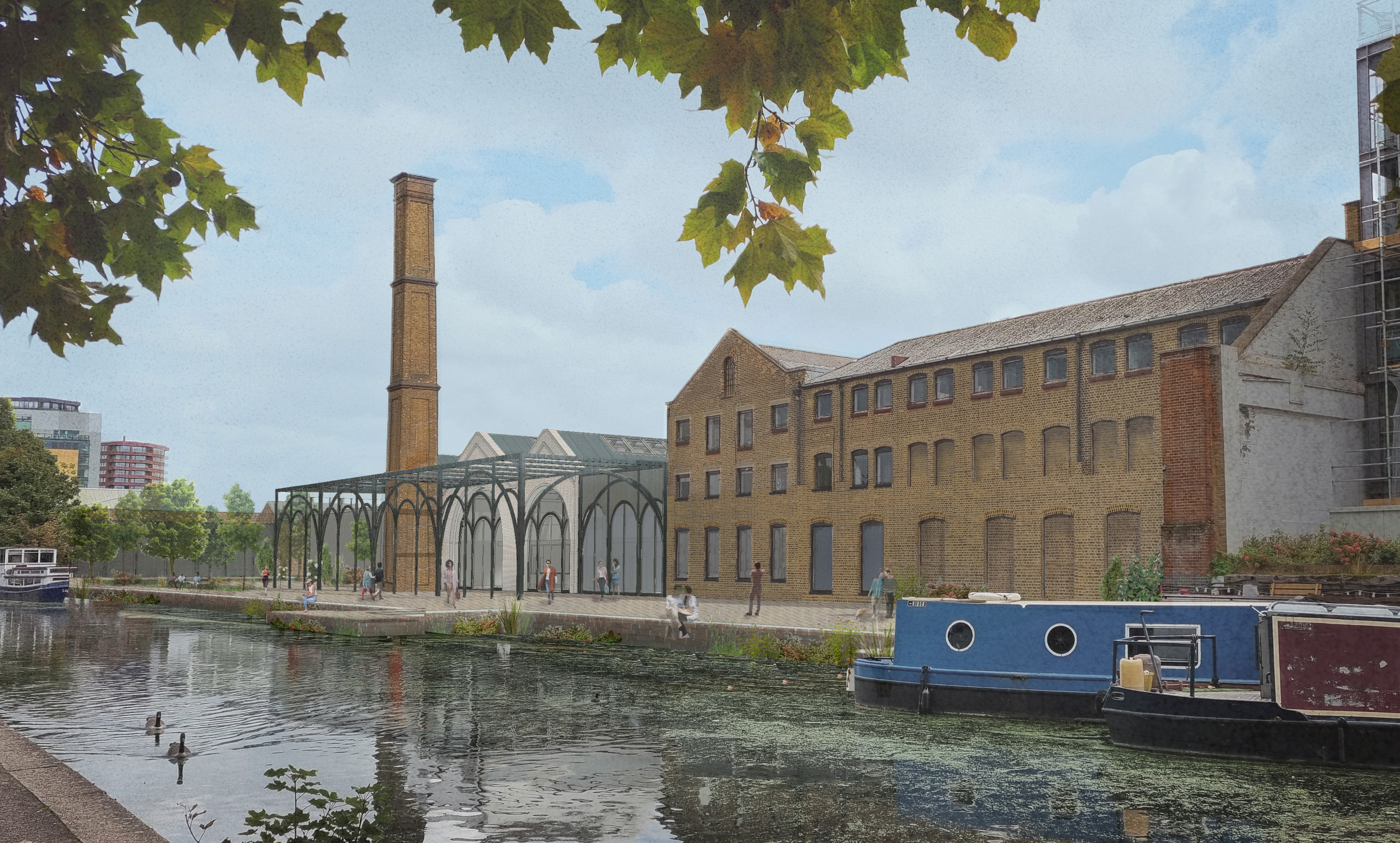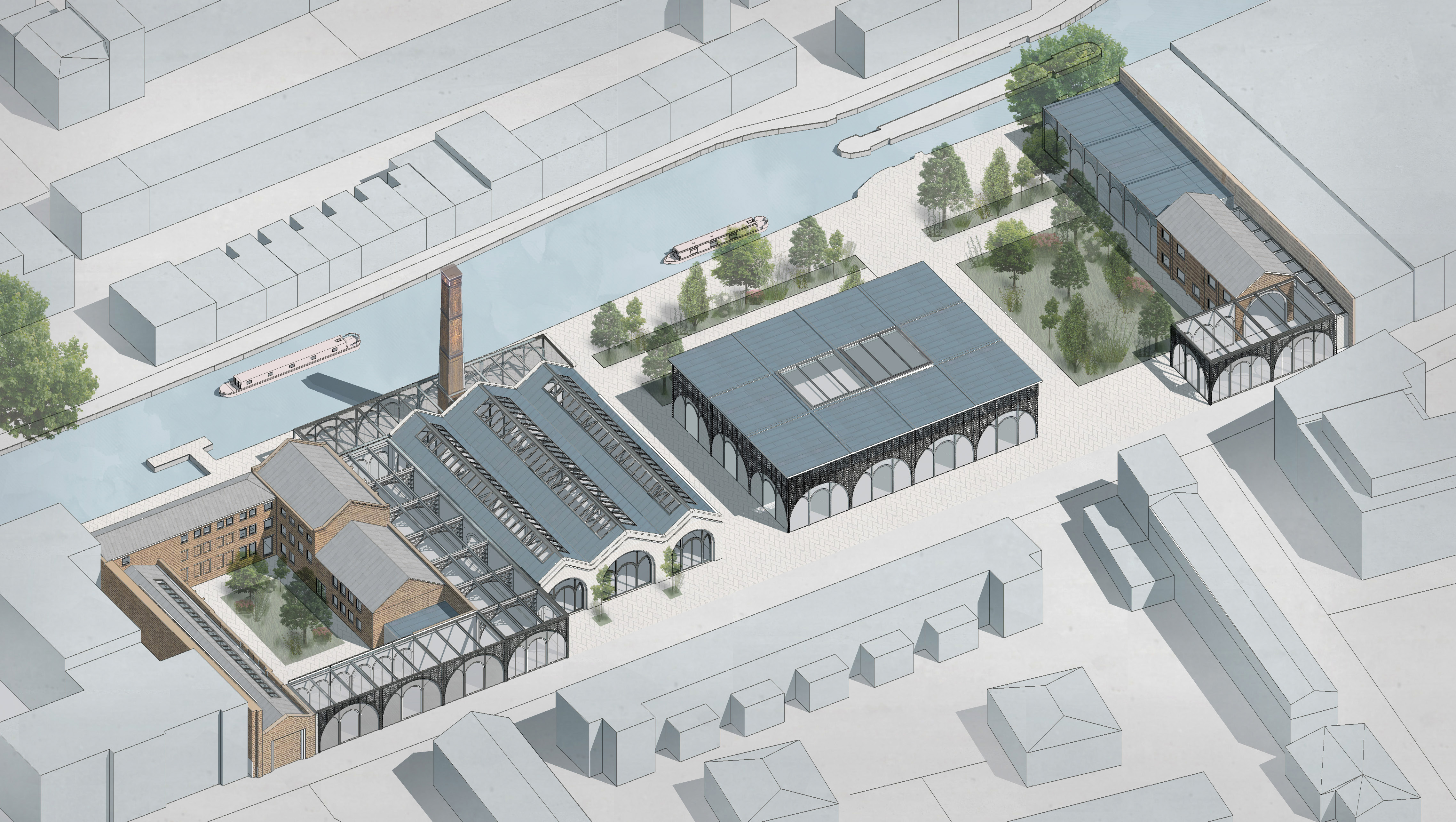 Visually, the new interventions seek to contrast with the remaining yellow brick elements. In an allusion to the historic site use, the architecture references Victorian ironwork with a language of metal arches and glazing. The rhythm of these arches has been formed in response to details of the site, creating a contemporary interpretation of a classic typology. Patterns and linework in metal were also investigated as graphic symbols of textiles processes. The motif is used in a variety of ways across the scheme, as screening, denoting entrances, as an outdoor canopy and as a procession within the central internal “street” from road to canal.