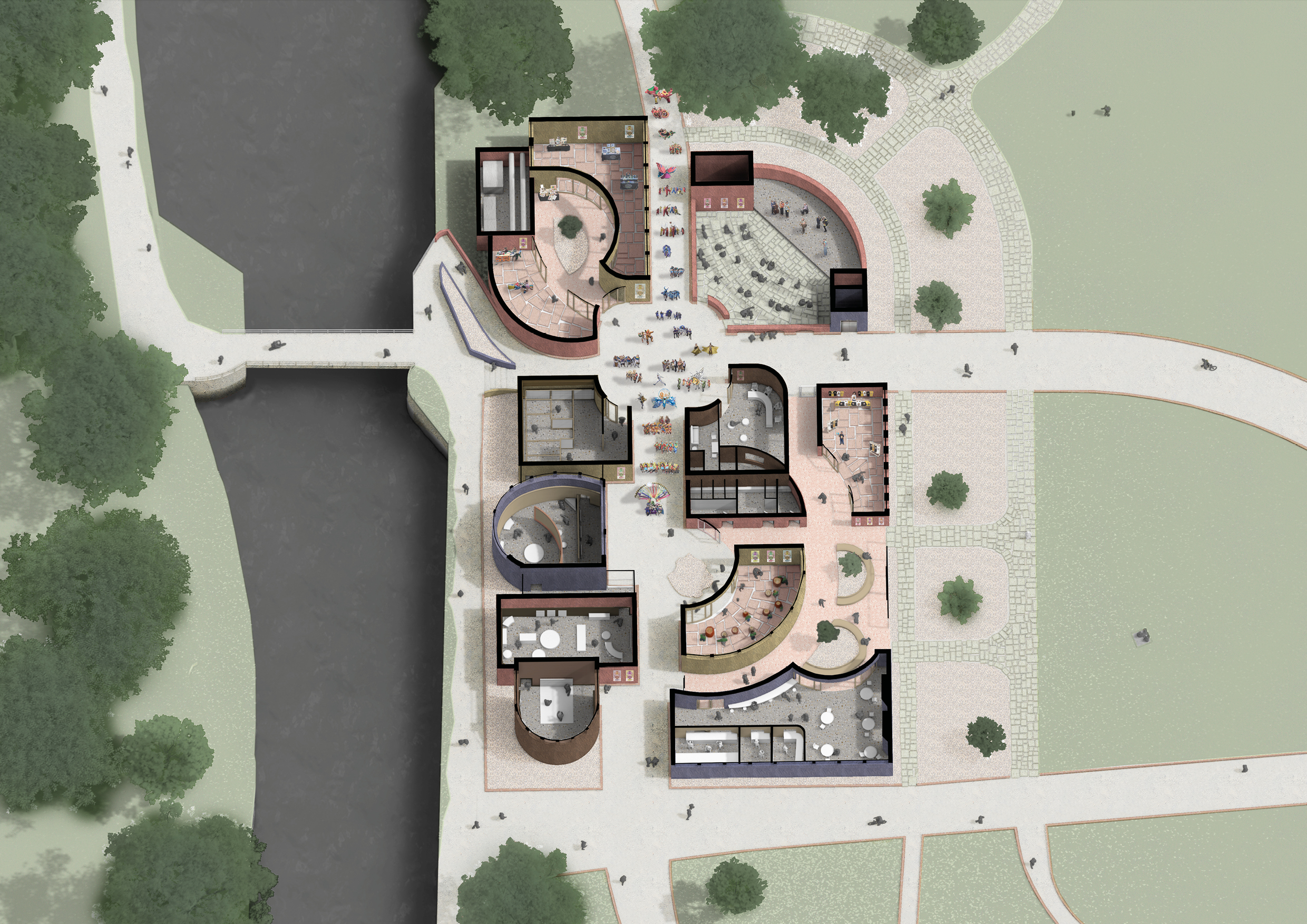 As a result, The Museum of Festivals exhibits the relationships between festival, city and society through the permanent collections and the flexible temporary studios which will be ever changing and curated by local communities. Mapping the existing routes showed that the park is both a destination and a place for passing through which is similar to the Victorian shopping arcades - “An invention of industrial luxury, glass-roofed corridors extending through whole blocks of buildings … the arcade is a city, a world in miniature” - Arcades Project, Walter Benjamin. Using the Milan arcade as a starting point for the plan has ensured a feel of grandeur and spectacle as well as including a permeability between interior and exterior. As a whole and individually, the festival typologies emerge which helps insert the building organically into the landscape.